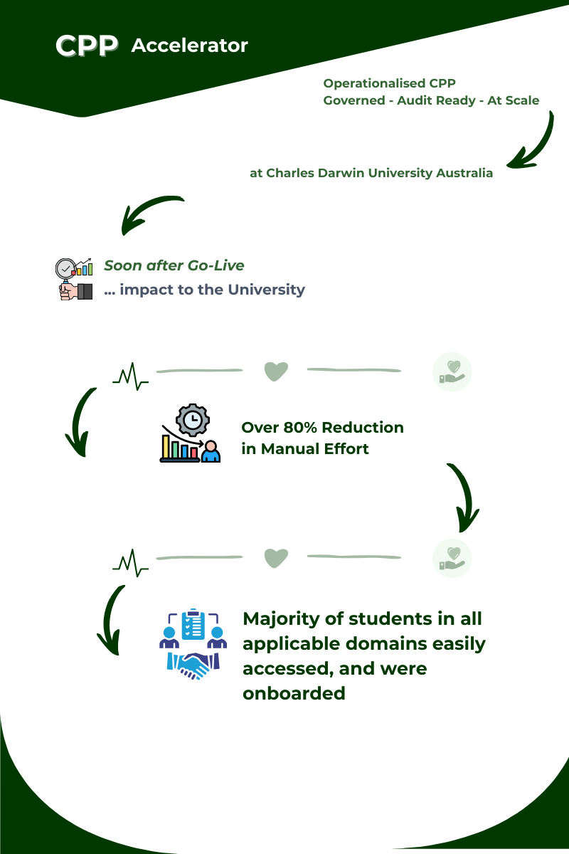 This infographic shows six key capabilities of the CPP Accelerator used at Charles Darwin University. These include rapid time to market through accelerator based delivery, enterprise grade security using Microsoft cloud infrastructure, improved student experience through mobile friendly interfaces, AI assisted application assessment with human oversight, flexible configuration using a no code approach, and operational sustainability through auditable and streamlined workflows.